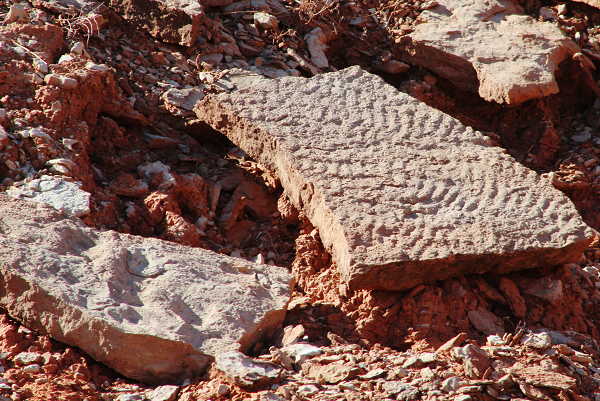Compare the ripples in the Permian age mudstone pictured here to the previous image. It is one of the ways that geologists try to explain what they see in the rocks they study. We have a current example of how running water can shape the surface of soils and and ancient example of the same kind of behavior. So, it is possible to infer that the ancient example was created in a similar fashion.