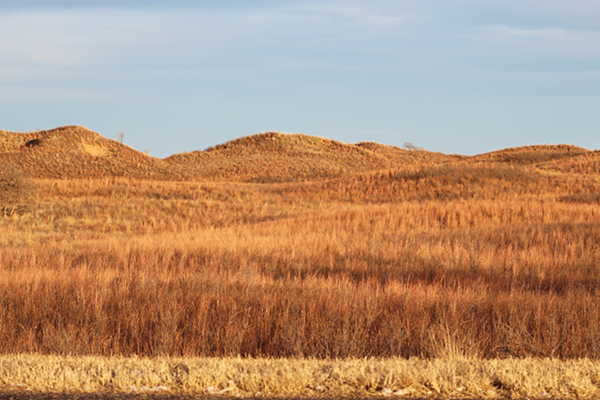 What you see here is a series of hills covered with grassy vegetation. The hills are primarily made of sand. The grasses help to keep these dune-like piles of sand from being blown away. One thing we have lots of, in the high plains of Texas, is wind.