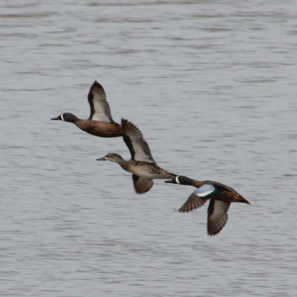 In the the third and last picture, two males are flying with a female between them. Note the colors under the wing in both sexes and notice the differences between breast and belly on males and females. Finally, most members of the subfamily Anatinae have a special group of feathers on the trailing edge of the upper wing feathers. This patch of feathers is referred to as the speculum which means a shiny or mirror-like surface. The feathers of the speculum in blue-winged teal are an irridescent green that you can see on the rightmost duck. In brighter light, the speculum appears as a shiny emerald green and is quite striking.