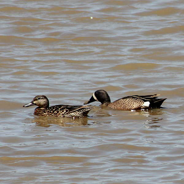 In the second image, you can see a male Blue-winged Teal on the left and a female on the right. His white crescent in front of the eye and white rump patch are clearly visible. Both ducks have large patches of grey-blue color on the upperside of each wing. In brighter light, this patch can appear almost white tinged with light blue. As you might have guessed, this species is named for this character.