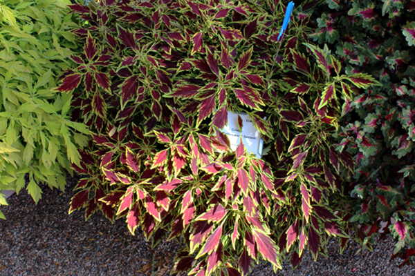 Here we have another type of Coleus called Flamethrower Chipotle where the red in the center of the leaves is reduced and is replaced by a thicker green zone at the leaf margin.