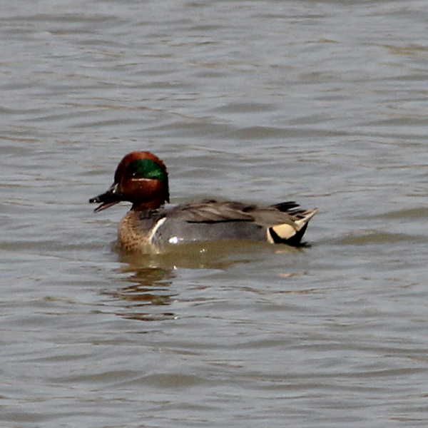 The male pictured above shows the cinnamon brown head with the iridescent green patch behind the eye. This is one of the distinguishing characters for this species. Note that this patch can appear bluish or black depending on the lighting conditions. The white stripe at the shoulder is another character unseen in the other teals. The light colored rump patch and the grey upper body and tail finish the list of distinguishing characters.