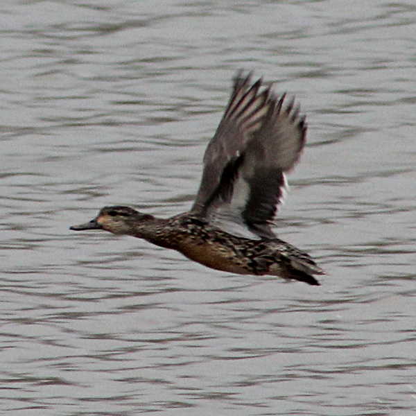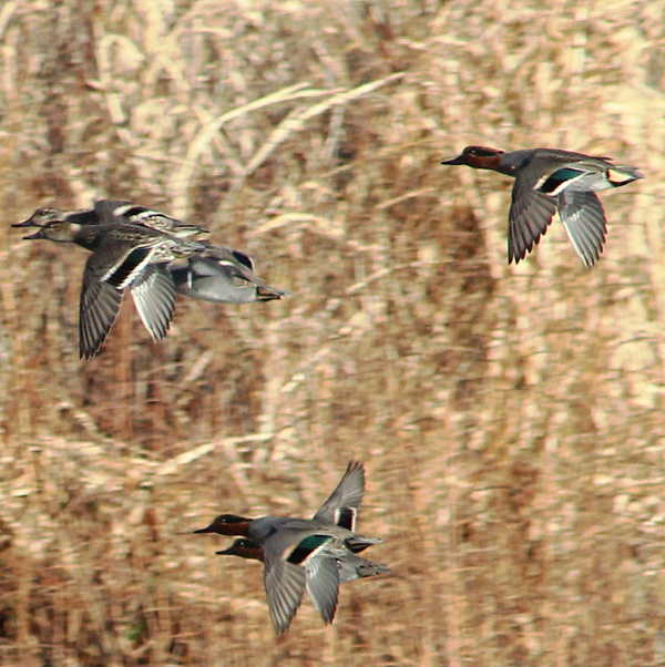 In the third photo, there are several Green-winged Teal in flight. Note the iridescent green speculum (shiny spot) on the trailing edge of their wings. This is the character for which they are named. It is present in both males and females. The speculum can appear deep bluish at times due to the way light is reflected off these special feathers. Can you spot the differences between males and females at this point?