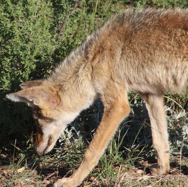 I recently spent part of a morning with a young coyote who appeared to be just old enough to be out hunting on its own. What was strange to me was her willingness to let me walk in her vicinity as she scavenged along a roadside. This usually indicates the animal is ill or possibly rabid. But, I believe this was not the case.