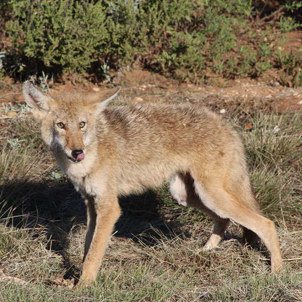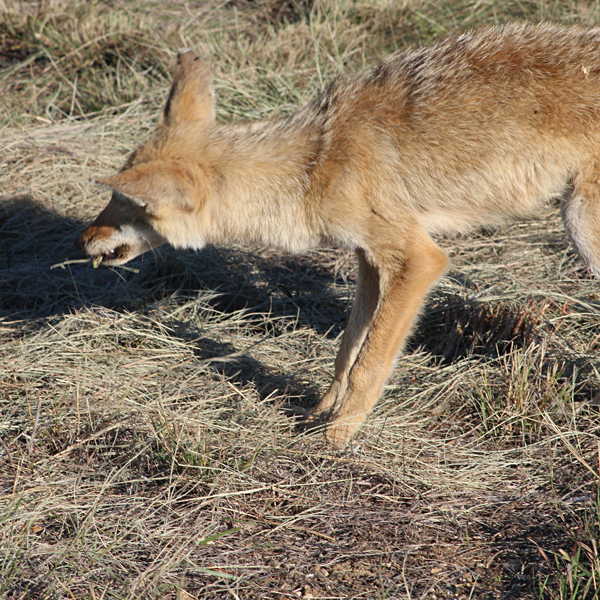 Coyotes in these parts are often heard but not seen since they are targets for cattle ranchers. Coyotes are known to prey on calves and have become problems, as a result, for stockmen. Thus, I felt very lucky to be able to be as close as I was to this animal and spend time observing her hunting grasshoppers and whatever other edibles she could find. From her condition, I suspect that meals have been few and far between since being weaned.