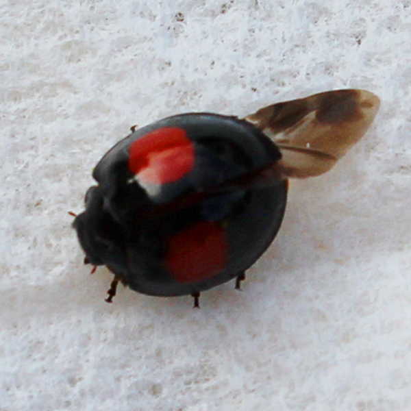 In this image you can see this little beetle is almost to my car keys. What is interesting here are the two red spots surrounded by shiny black on the elytra or shell-like fore-wings common to Coleopterans, or beetles as most folks know them. Also, a portion of the right hindwing is visible because this individual had attempted to fly away during all the hullabaloo and didn’t get his wing tucked back under the elytra.