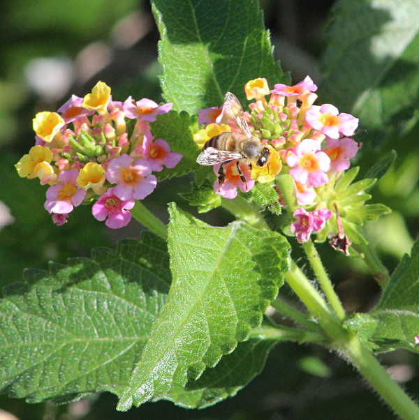 The plant pictured here is a variety of Lantana camara, family Verbenaceae. It is a native of the Gulf Coast portion of United States from Georgia to Texas. It likes well drained soil and resists drought and salt spray well. It can grow in partial shade but prefers sunny locations. The many flowered head of this variety produces pink blooms with orange centers and yellow blooms with deeper yellow centers.