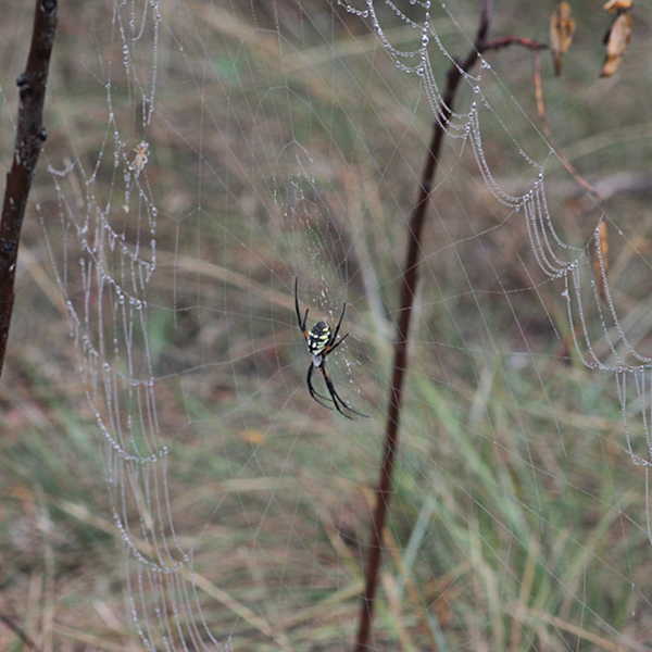 In these photos you see three different examples of Argiope sp. that is common to North Central Texas. All are females because of their large size. The photograph above shows an Argiope in the center of her dew-covered web. Notice how large the web is relative to the 3 inch spider (leg tip to leg tip). She is also located in the center of her web which is characteristic of the genus Argiope. The round web is made by members of the Araneidae family, or Orb-